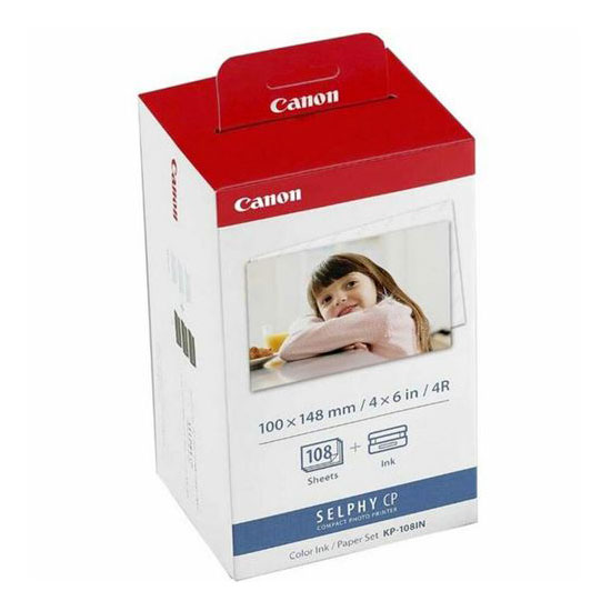 Canon kit KP-108IN, Bénéficiez d’une impression portative haute qualité avec l’ensemble d’encre couleur/de papier de format carte postale KP-108, qui comprend 108 feuilles de papier photo de 4 x 6 po (environ) et 3 cartouches d’encre. Ces photos de format carte postale sont imprimées à l’aide de la technologie d’impression à sublimation thermique, ce qui signifie que dès que votre impression est terminée, elle est instantanément sèche, sans bavures et résistante à l’eau.
