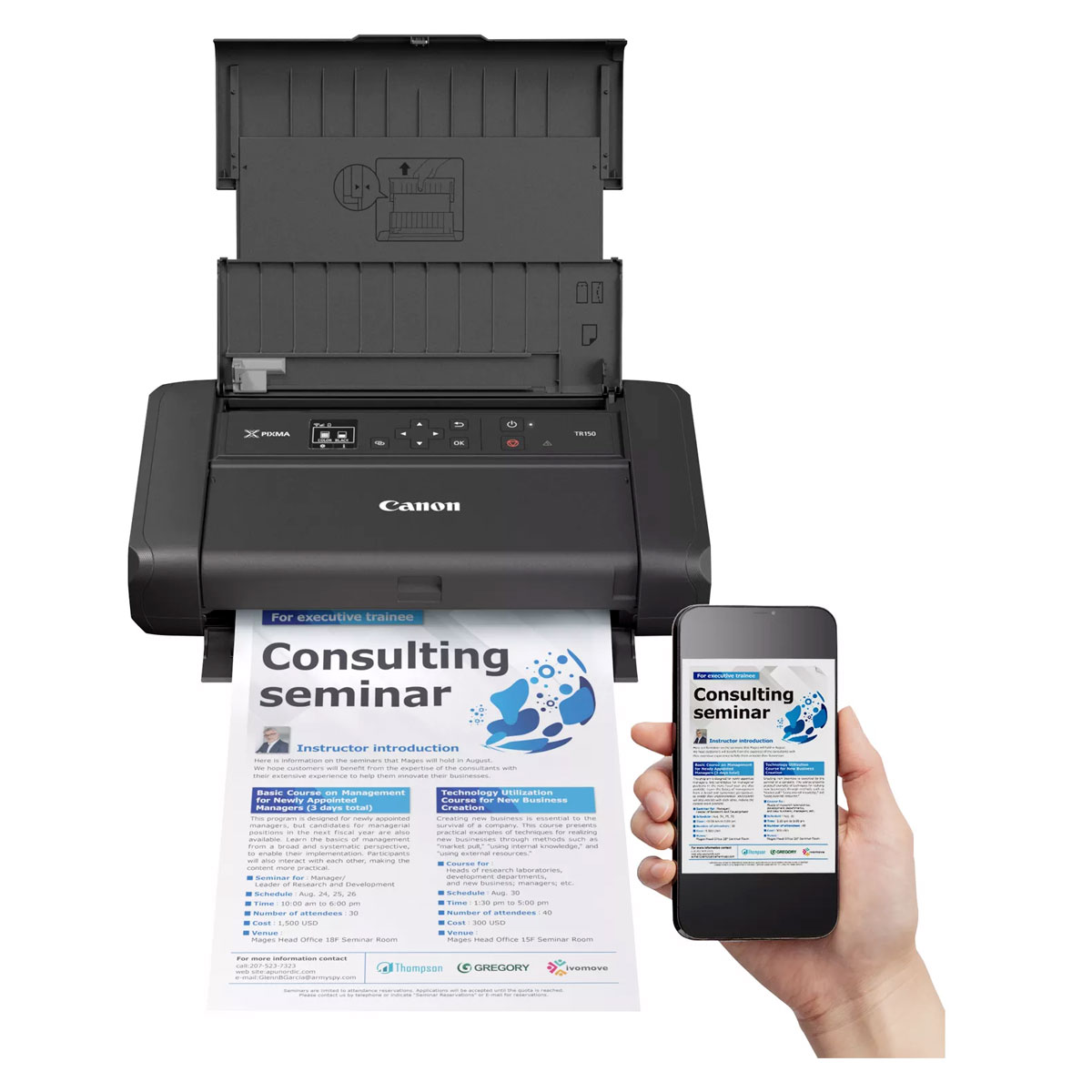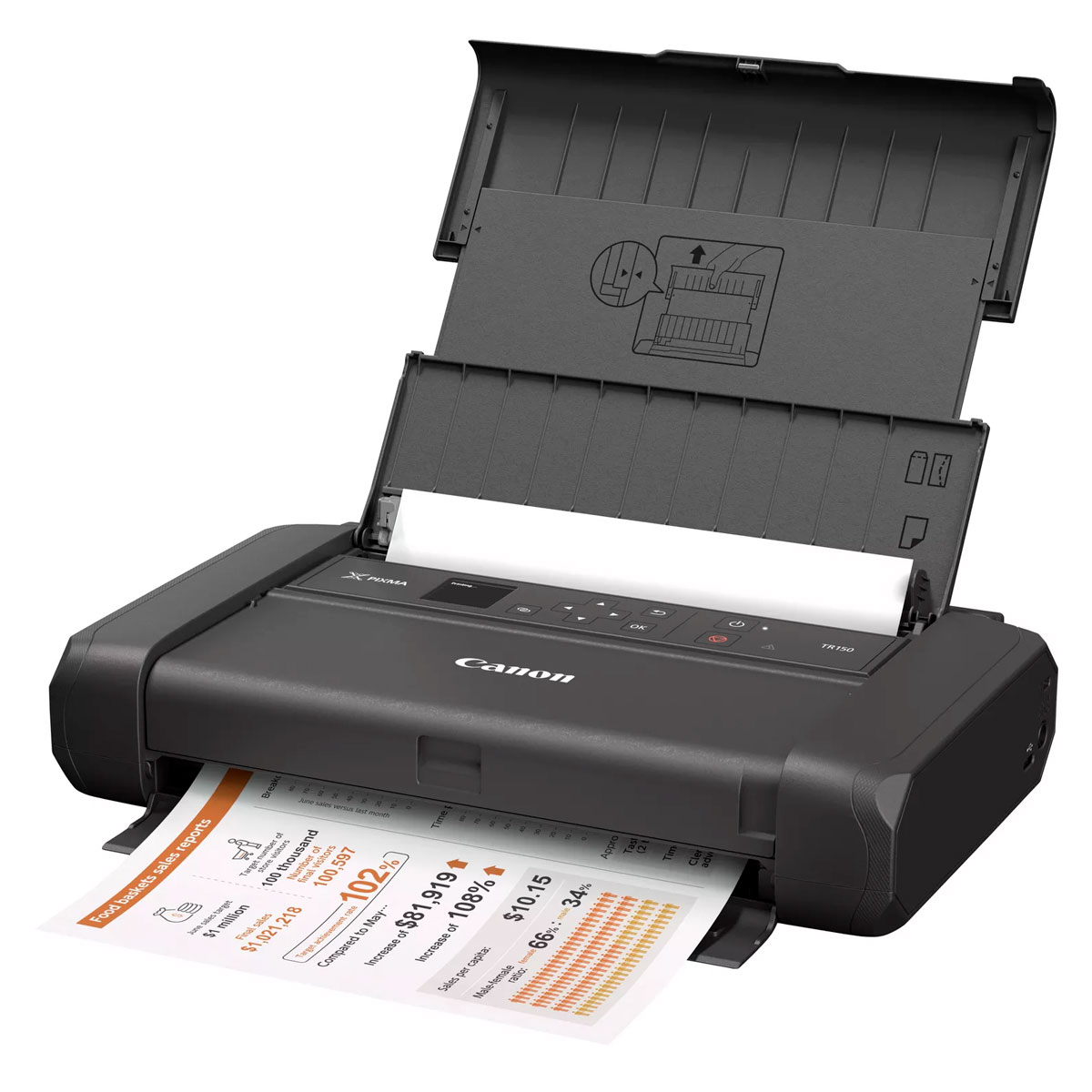 Imprimante mobile Canon PIXMA TR150, Votre activité vous suit partout. Légèreté, portabilité, connectivité sans fil polyvalente et contrôle sur smartphone : profitez de résultats professionnels et sans effort, où que vous soyez.