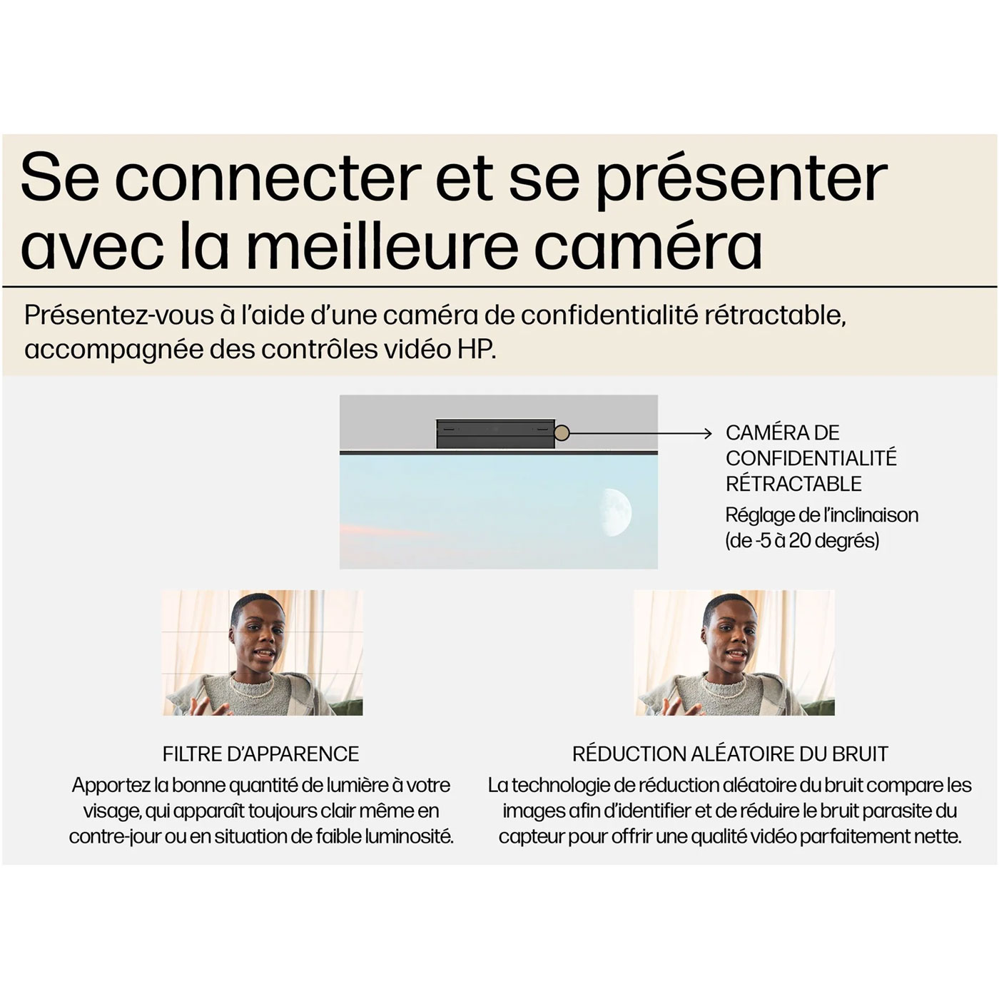 | Caméra | Caméra de confidentialité inclinable HP True Vision 720p HD avec réduction du bruit temporel et microphones numériques à double entrée intégrés |
