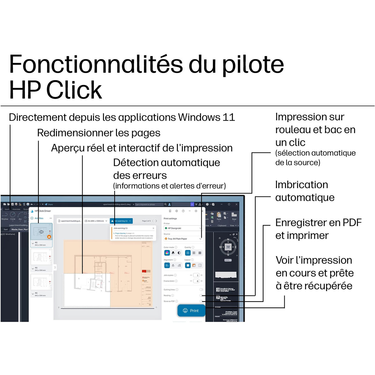 Simplifiez l’impression avec les nouvelles solutions d’impression HP Click – gagnez du temps grâce à l’aperçu avant impression réel. [2] Imprimez automatiquement des projets /A à A0/E de formats A4multiples sans changer manuellement de source de support. Imprimez vos travaux et gérez votre traceur pratiquement n’importe où, n’importe quand avec l’application HP Smart.