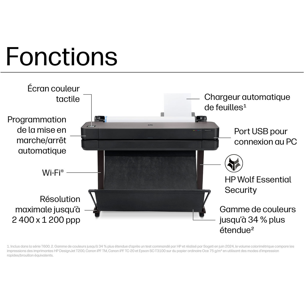 Économisez de l’espace avec les plus petits traceurs au monde, conçus pour s’adapter à votre bureau, avec notamment un socle intégré. Évitez d’attendre près de l’imprimante grâce à une impression de 30 secondes seulement par tracé A1. Protégez votre imprimante contre les cybermenaces avec HP Wolf Essential Security. Obtenez des résultats de haute qualité – Les encres HP Bright Office offrent une meilleure précision de ligne et jusqu’à 34 % de gamut en plus.