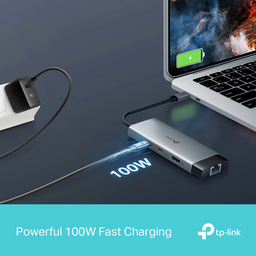 Hub USB-C 6 en 1 : le TP-LINK UH6120C transforme un seul port USB-C en 6 ports avec un HDMI 4K à 60 Hz, un Ethernet 1 Gbit/s, une alimentation 100 W, 1 port de données USB-C, 2 ports de données USB-A.