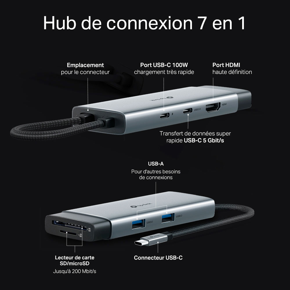 Hub USB Type-C 7 en 1 : le TP-LINK UH7020C transforme un seul port USB-C en 7 ports avec un HDMI 4K à 60 Hz, SD et microSD UHS-I, une alimentation 100 W, 1 port de données USB-C, 2 ports de données USB-A.